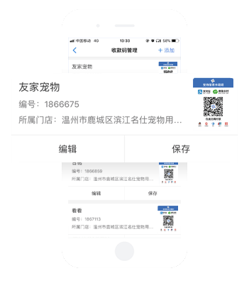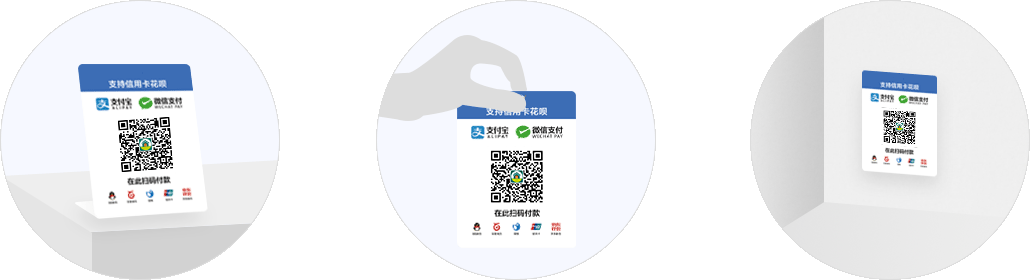 收款码台卡可放置于收银台,也可拿到顾客面前完成收款,收款码贴纸可张贴于店铺各处收款